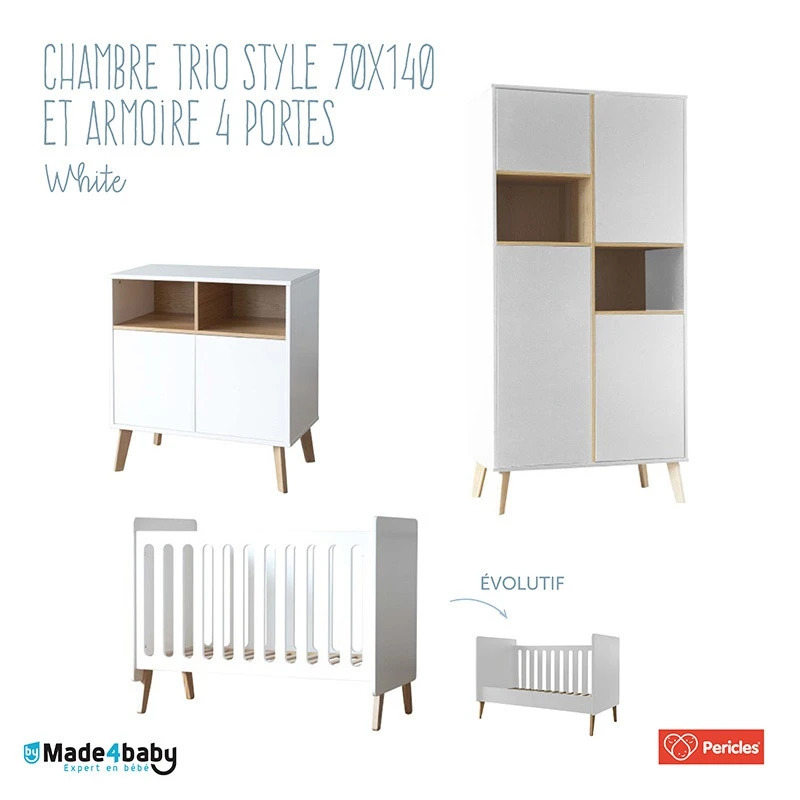 La chambre Trio avec lit 70 x 14.0 cm et armoire 4 portes Périclès Style blanc est fonctionnelle et robuste, conçue pour accompagner durablement votre enfant et lui créer un superbe univers, harmonieux et réconfortant.
