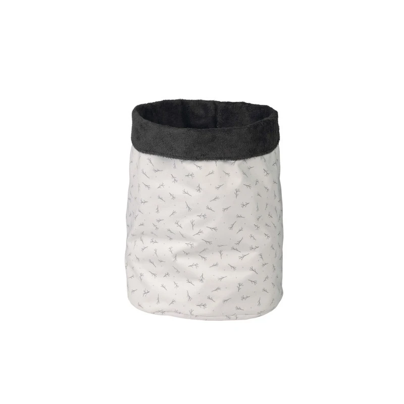 La corbeille de rangement Périclès Misty décore aussi magnifiquement son environnement. Elle propose un très joli coton blanc imprimé de fins motifs végétaux, doublé d’un tissu uni à bouclettes d’une belle couleur grise.