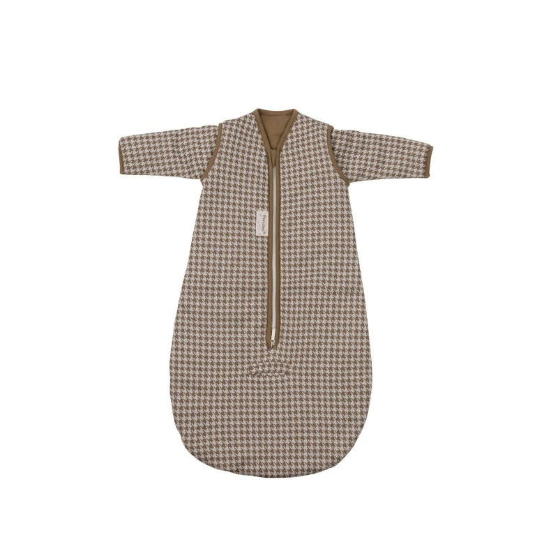 La gigoteuse naissance avec manches Périclès Coffee est réalisée dans un très beau tissu imprimé pied de poule et peut être lavée facilement en machine à 30 °C.