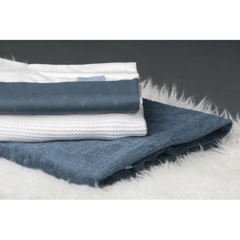 La parure de berceau Périclès Steel est fabriquée en coton de très haute qualité, certifié Oeko-Tex® pour garantir le respect de la peau délicate et de la santé de votre bout de chou. Le drap plat est décoré, sur le revers, de délicats motifs jaunes dorés sur un fond bleu-gris, qui apportent beaucoup de chic et de modernité à l’ensemble, et il est accompagné d’une taie d’oreiller coordonnée.