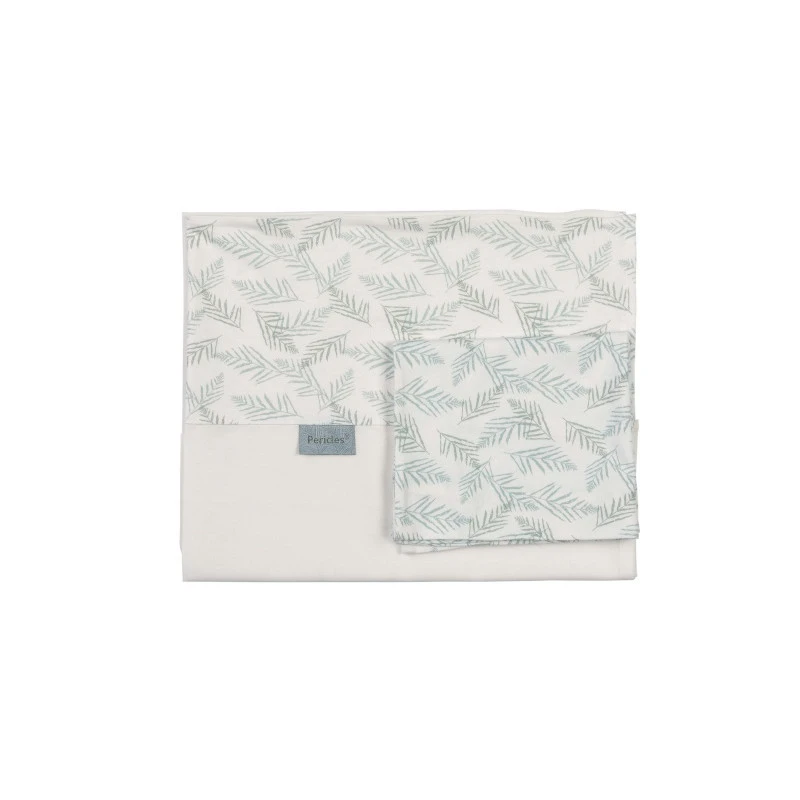 Le drap plat blanc est décoré, sur le revers, de jolis motifs végétaux verts sur fond clair qui lui donnent beaucoup de chic et de modernité, et il est accompagné d’une taie d’oreiller coordonnée.