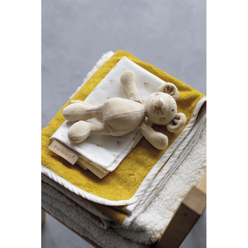 Le temps du bain est fini, et votre bout de chou doit maintenant sortir de l’eau, choisissez la sortie de de bain + gant Périclès Gold pour le sécher délicatement. C’est un vêtement facile à utiliser avec un tout petit : un grand carré qui s’enroule vite fait autour de bébé, équipé d’une capuche dans un angle pour abriter sa tête. Tendrement, vous prolongez ainsi les moments de jeu et de complicité partagée, sans stress.