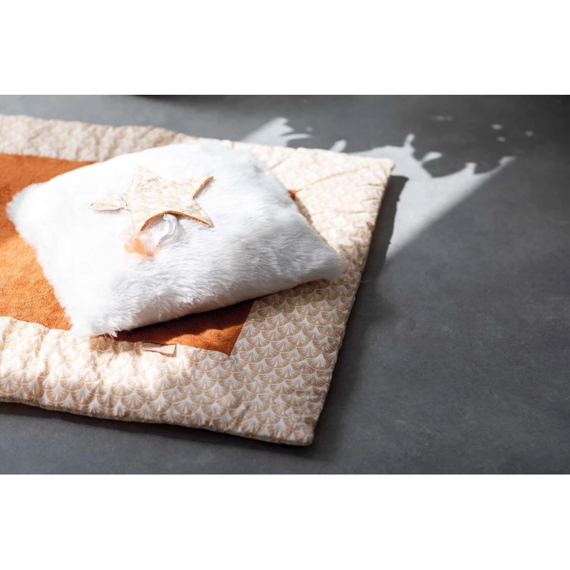 Le tapis de parc Périclès Terra est réversible : d’un côté, un magnifique coton imprimé de motifs végétaux brun-rouge sur fond blanc, de l’autre un tissu uni à bouclettes coordonné, majoritairement composé de bambou et bordé tout autour du même imprimé. Afin de respecter la peau délicate de votre bout de chou, sachez que tous les tissus utilisés sont certifiés Oeko-Tex®, garantissant la non-toxicité des textiles et colorants.