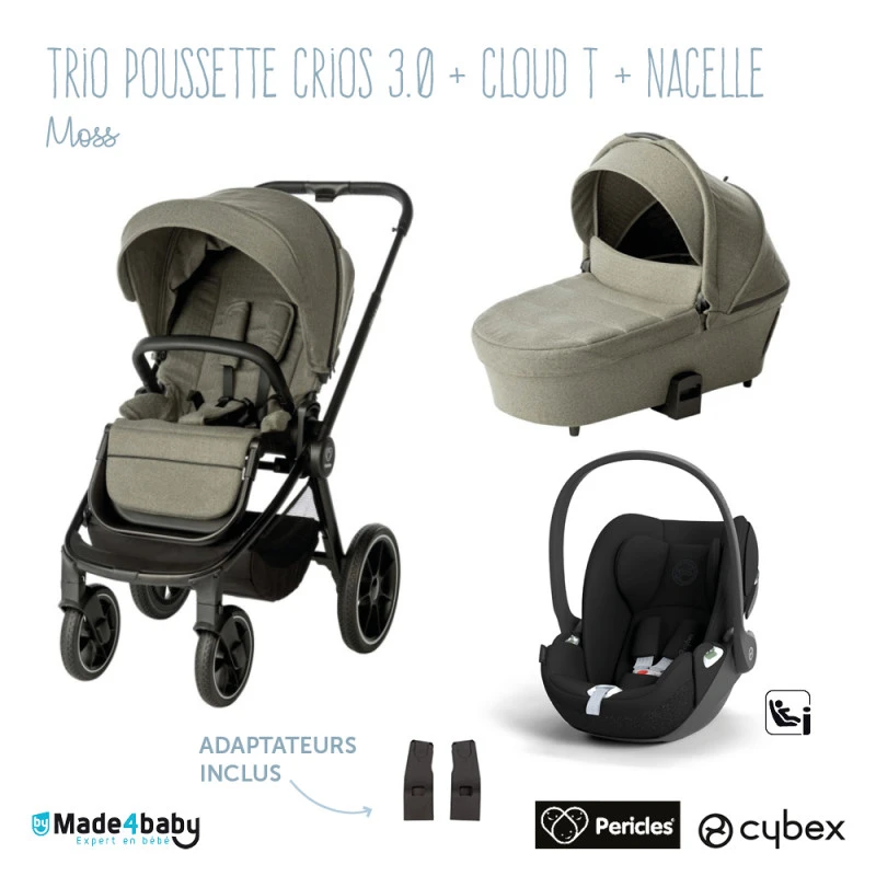 Ce trio que vous nous proposons comprend la poussette et la nacelle assortie Crios 3.0 de Péricles, ses adaptateurs pour cosi ainsi que le siège auto Gr0+ Cloud T i-Size de Cybex.